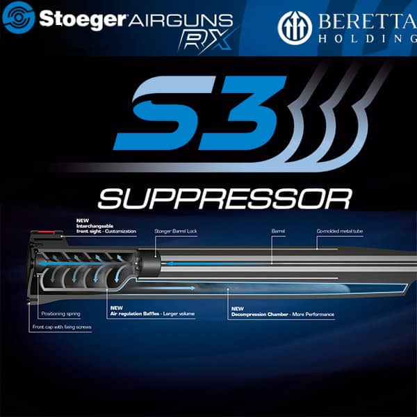 El nuevo S4 SUPPRESSOR patentado es el último diseño de Stoeger AIRGUNS con sistema silenciador integral, combina el DOBLE EFECTO de los deflectores y la cámara de descompresión y ahora la tecnología compensadora adicional. El nuevo XM1 incorpora la tecnología más avanzada para reducir el ruido mejor que nunca. Lo mejor de su clase.