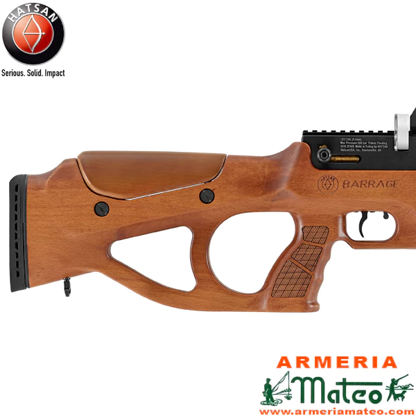 La carabina Hatsan Barrage W Semiautomática presenta un diseño con culata thumbhole en madera, con un depósito de aire de 500 cc de capacidad y desmontable.