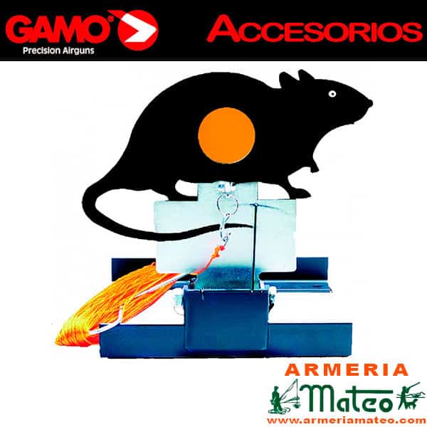 Diana abatible Gamo fabricada en acero. Al impactar el balín con la parte amarilla de la rata, ésta se tumba, al tirar de la cuerda vuelve a su posición inicial. Longitud de la cuerda: 45 metros.