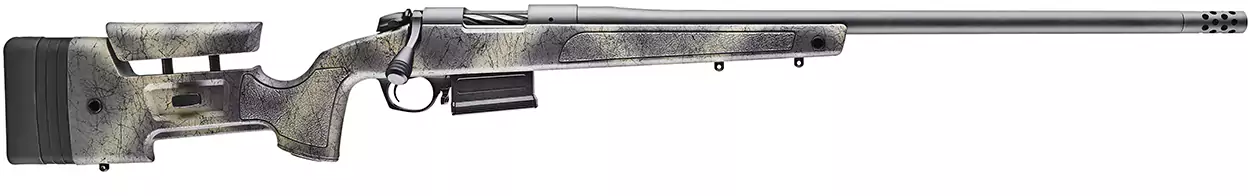 El cañón de acero Bergara 4140 CrMo tiene un acabado Sniper Grey Cerakote®. Rosca en boca e incluye un freno omnidireccional Bergara.