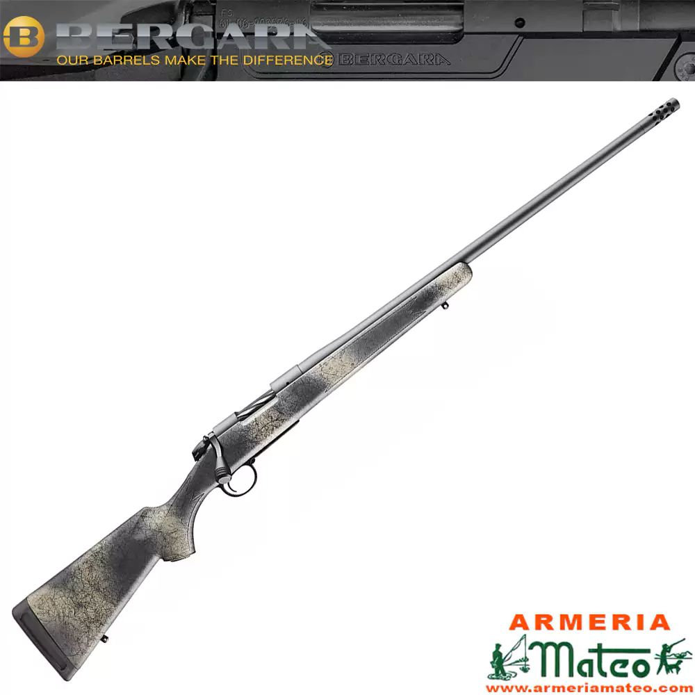 El cañón de acero Bergara 4140 CrMo tiene un acabado en Sniper Grey Cerakote. Todos los cañones llevan rosca en boca y freno omnidireccional.