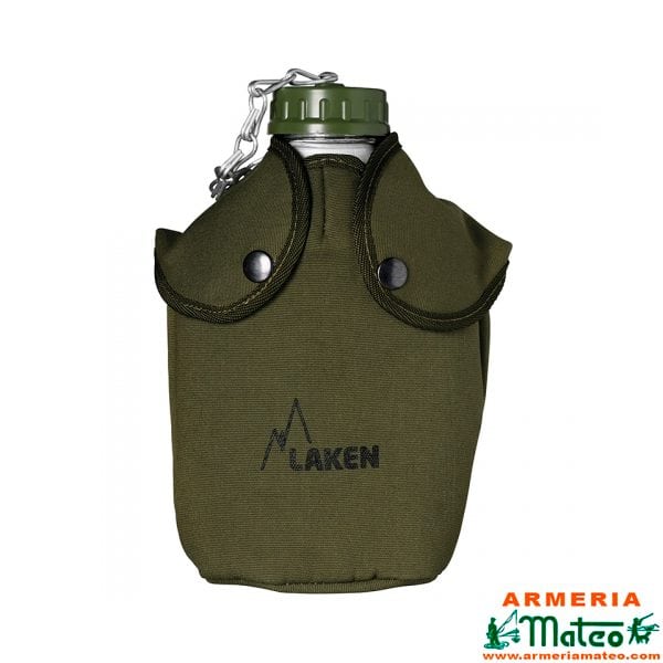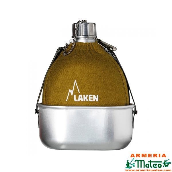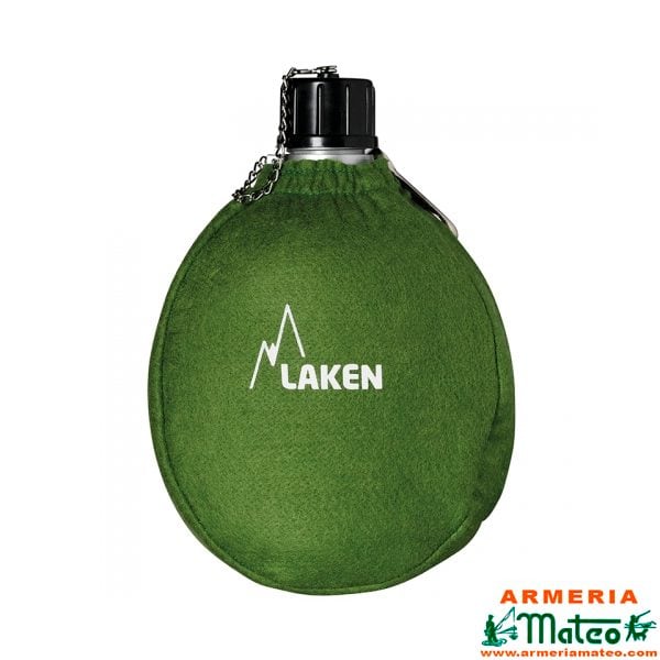 Cantimplora Laken Clásica, fabricada en aluminio y con revestimiento interior sanitario. Funda de fieltro desmontable y mosquetón de transporte.