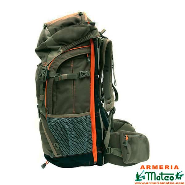 Tiene una extensión para transportar caza o venado, esta extensión es operativa abriendo una ZIP naranja que envuelve la bolsa, liberando 4 correas con hebillas que mantienen la carga entre la espalda y el compartimento principal.