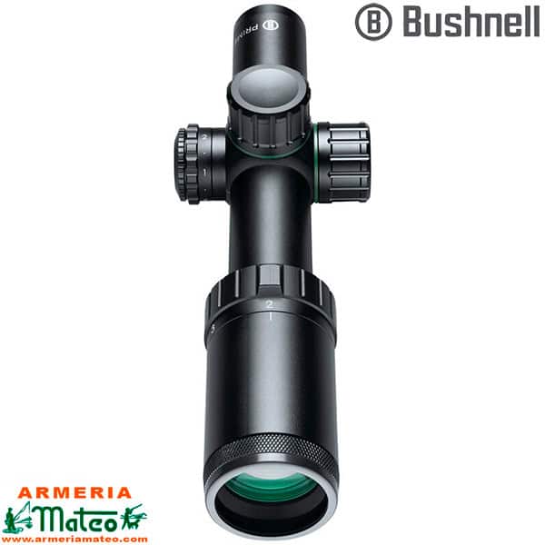 Visor Bushnell Prime 1-4×24 tiene un rango mínimo de aumentos de 1x, proporciona un muy buen campo de visión (31,4m@1X-7,8m@4X; a 100 metros) convirtiéndolo en un visor ideal para caza en batida o montería. Llama la atención su línea y excelente acabado y se caracteriza por su robustez y peso moderado. Retícula 4A con punto central iluminado.