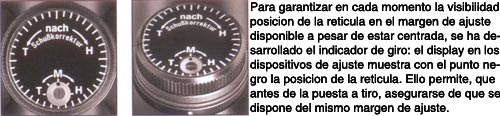 Antes del primer montaje, es importante conocer la posición de la retícula, para que el cazador disponga de un margen de ajuste lo suficientemente grande al efectuar la puesta a tiro. Con el Indicador Posion es muy sencillo: El puntero del indicador informa sobre la posición de la retícula. Con el puntero en el margen verde, la retícula se encuantra dentro del margen de ajuste cuadrado, en el que queda excluído que los movimientos de ajusten se afecten mutuamente. El margen rojo, muestra ajustes reservados que se pueden utilizar en caso necesario y advierte al mismo tiempo que, con el uso excesivo de un ajuste, queda reducida la extensión del otro. El anillo plateado en el indicador respectivo permite hacer una marca para repeticiones exactas después de la puesta a tiro, en el que el usuario puede aplicar también marcas propias para determinadas distancias o diferentes cargas.