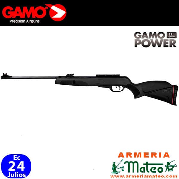 GAMO POWER: las últimas carabinas de aire comprimido GAMO Power están diseñadas específicamente para proporcionar la máxima potencia gracias a su nueva cámara cilíndrica de 33 mm de diámetro. Esto incorpora la combinación perfecta de un muelle y émbolos más grandes permitiendo a éstas carabinas mover un volumen más alto de aire. La gama GAMO Power ofrece la máxima potencia y control cuando más lo necesitas! LA MÁXIMA POTENCIA EN UNA CARABINA DE SERIE.